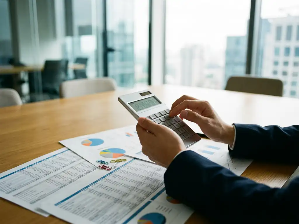 Geschäftsführer hält Taschenrechner über Finanzberichte mit Diagrammen auf Konferenztisch im modernen Büro